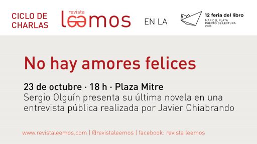 El Ciclo de Charlas organizadas por la Revista Leemos en la 12°Feria del Libro de Mar del Plata, tendrá un cierre de lujo. El domingo 23 a las 18, el periodista y escritor Sergio Olguín presentará su libro No hay amores felices, que acaba de editar bajo el sello Suma de Letras y será entrevistado por el también escritor y periodista Javier Chiabrando.