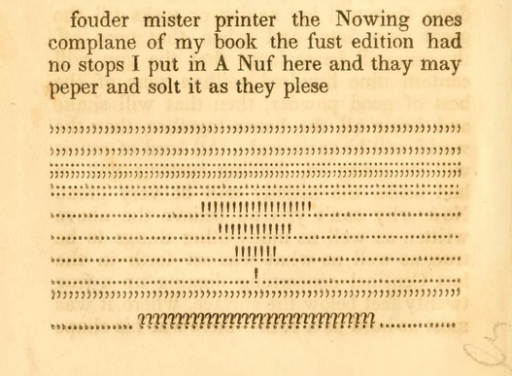 Como dijimos, Timothy Dexter fue un personaje extraordinario. Quizás inimputable. Cuando algunos lectores se quejaron por la dificultad que presentaba el texto haciendo hincapié en la falta de signos de puntuación, el ingenioso Timothy agregó a la segunda edición trece páginas repletas de comas, puntos, paréntesis, signos de interrogación y exclamación para que el lector pueda “aderezar y salar (el texto) a su sabor”.