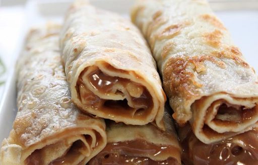 Untar con dulce de leche cada disco de masa de panqueque y formar pequeños cilindros. También pueden doblarlos por la mitad y otra vez por la mitad, formando una especie de pañuelitos. Si los preparan cuando la masa aún está tibia, mucho mejor. Para presentar, espolvorear por encima con un poco de azúcar, azúcar impalpable o coco rallado.