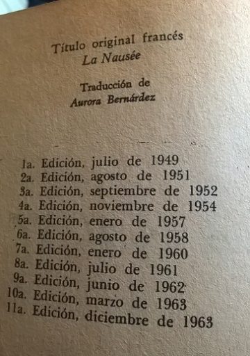 Leía, o releía, después de 30 o 40 años, La Náusea, de Jean-Paul Sartre (con traducción de la gigantesca Aurora Bernárdez), quería ver qué de ese texto perduraba en mí, que sensación, qué recuerdo. Había subrayado: “Esto es vivir. Pero al contar la vida, todo cambia; solo que es un cambio que nadie nota; la prueba es que había historias verdaderas.” Seguí recorriendo algunas frases, hoy no sé que encontré en ellas, pero lo que más me impresionó –verdaderamente-, es descubrir que Losada había publicado la primera edición en 1949. En mi mano tengo la edición de diciembre de 1963, aclaro “diciembre”, porque en marzo de ese año se había hecho otra edición. Esta, la que tengo, es la decimoprimera: ¡Once ediciones en 14 años! Casi una por año.
