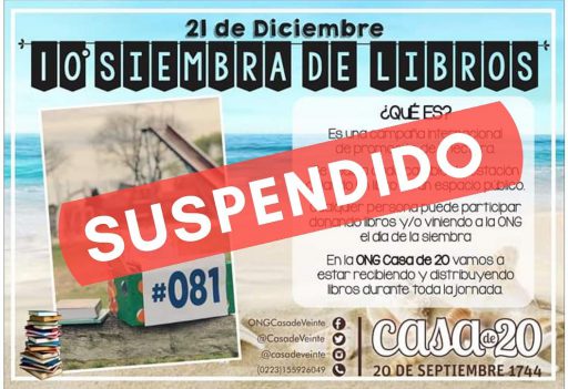 La ong “Casa de 20” anunció que por el momento se encuentra suspendida la Siembra de Libros que iba a realizarse el 21 de diciembre, dado que la sede en la que se centralizan las operaciones se encuentra en las inmediaciones de la manzana afectada por el incendio ocurrido en la distribuidora Torres y Liva.